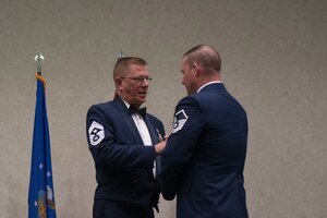 Master Sgt. Jason Sanderson, aircraft mechanic for the 123rd Airlift Wing, receives the Kentucky Enlisted Exceptional Performance Award from Chief Master Sgt. Jeff Moore, Kentucky’s state command chief, during the Soldier and Airman of the Year banquet at the Kentucky Fair and Exposition Center,