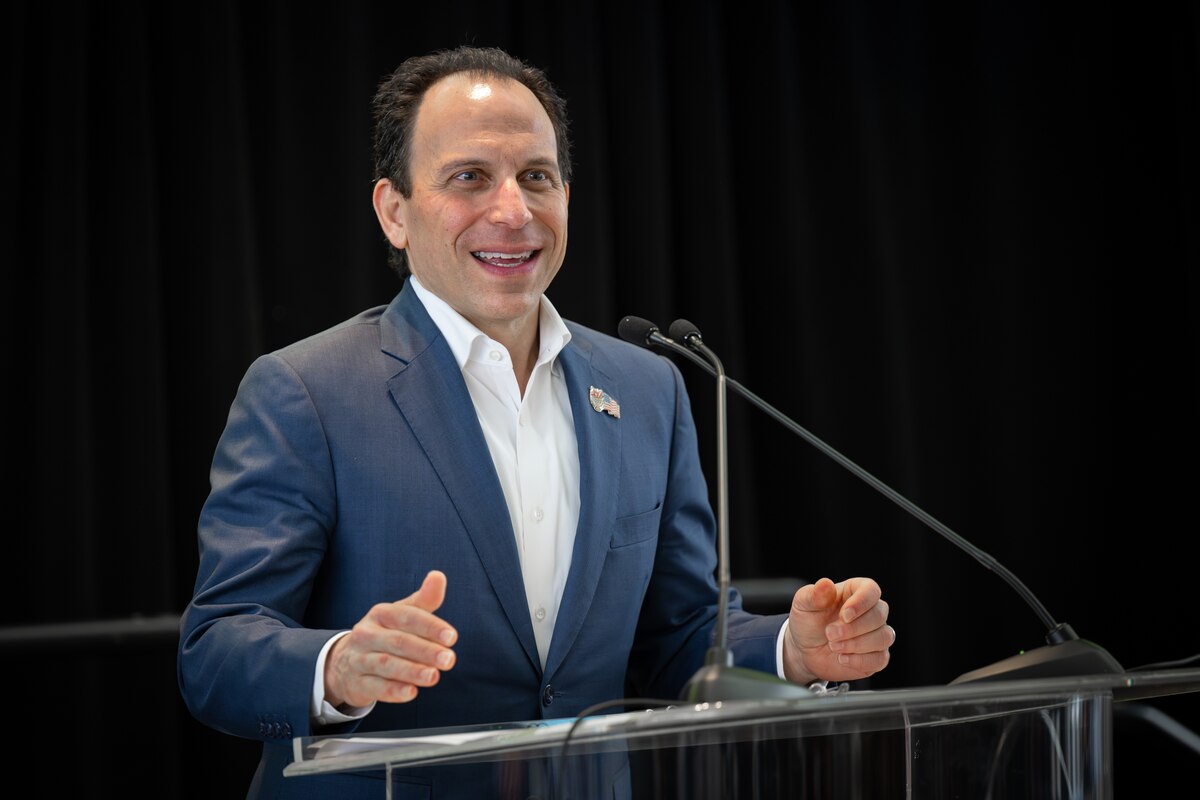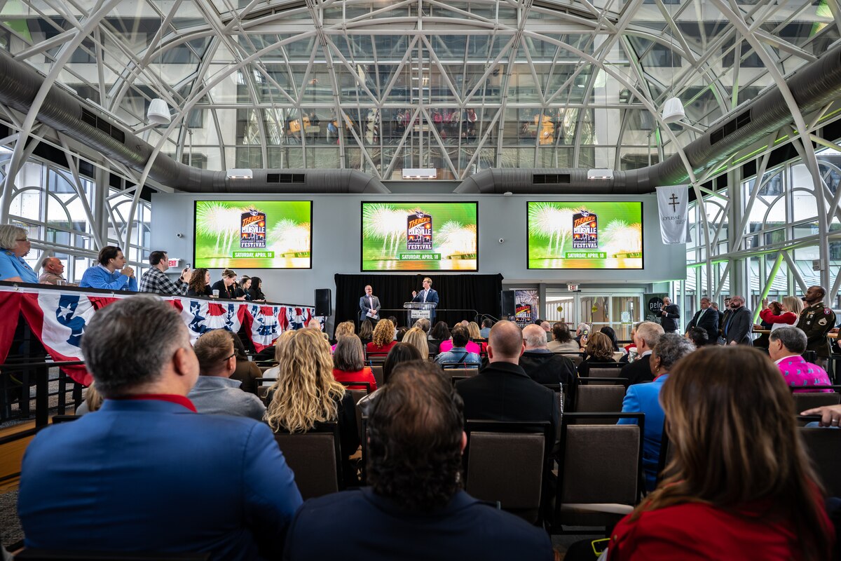 Kentucky Gov. Andy Beshear, right, speaks at a press conference in Louisville, Ky., Feb. 23, 2025, announcing the return of the Thunder Over Louisville air show and fireworks display to the banks of the Ohio River April 18, as Matt Gibson, president and CEO of show organizer Kentucky Derby Festival, looks on. Historic flooding caused the cancelation of last year’s event, which typically draws more than 100,000 spectators. (U.S. Air National Guard photo by Dale Greer)