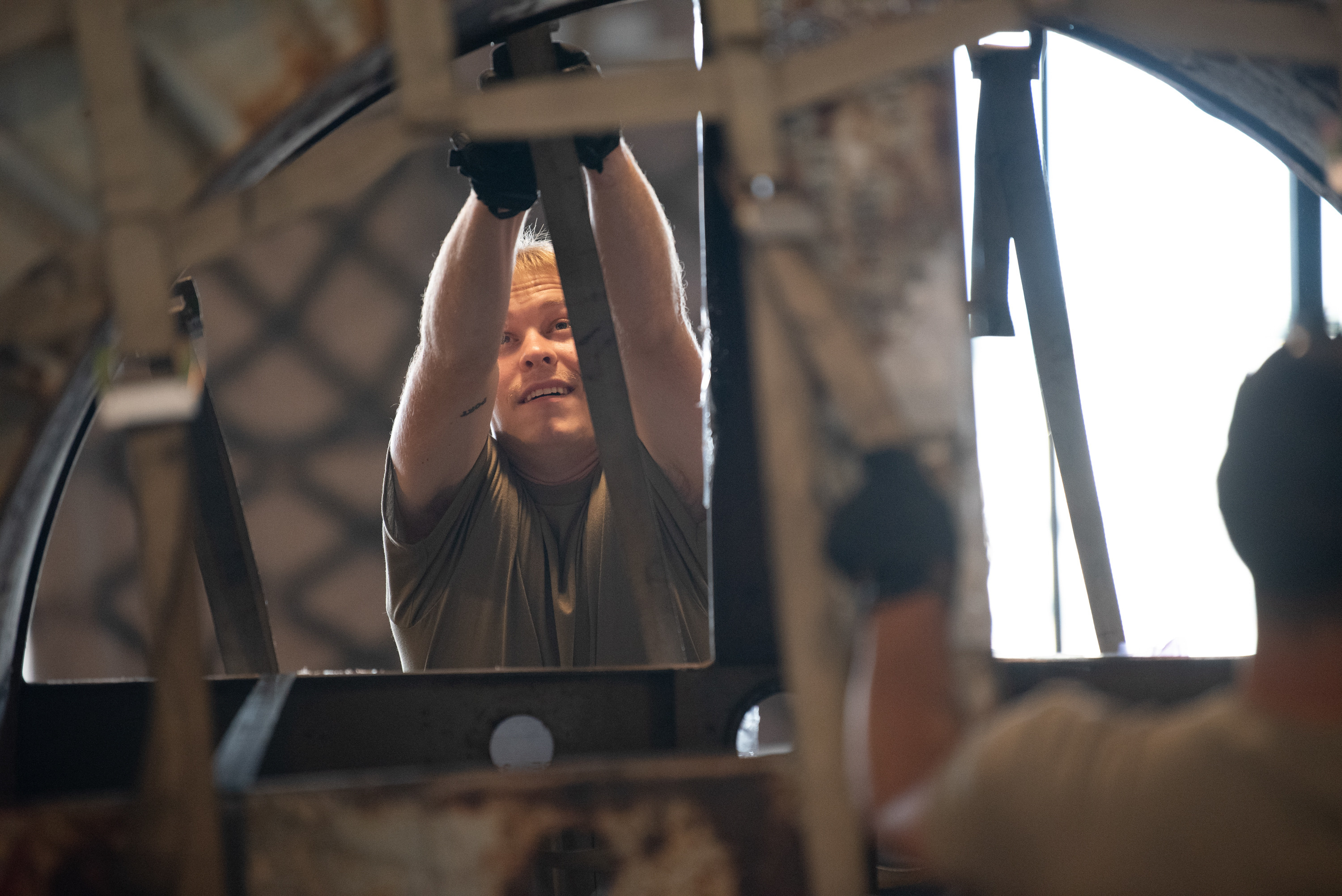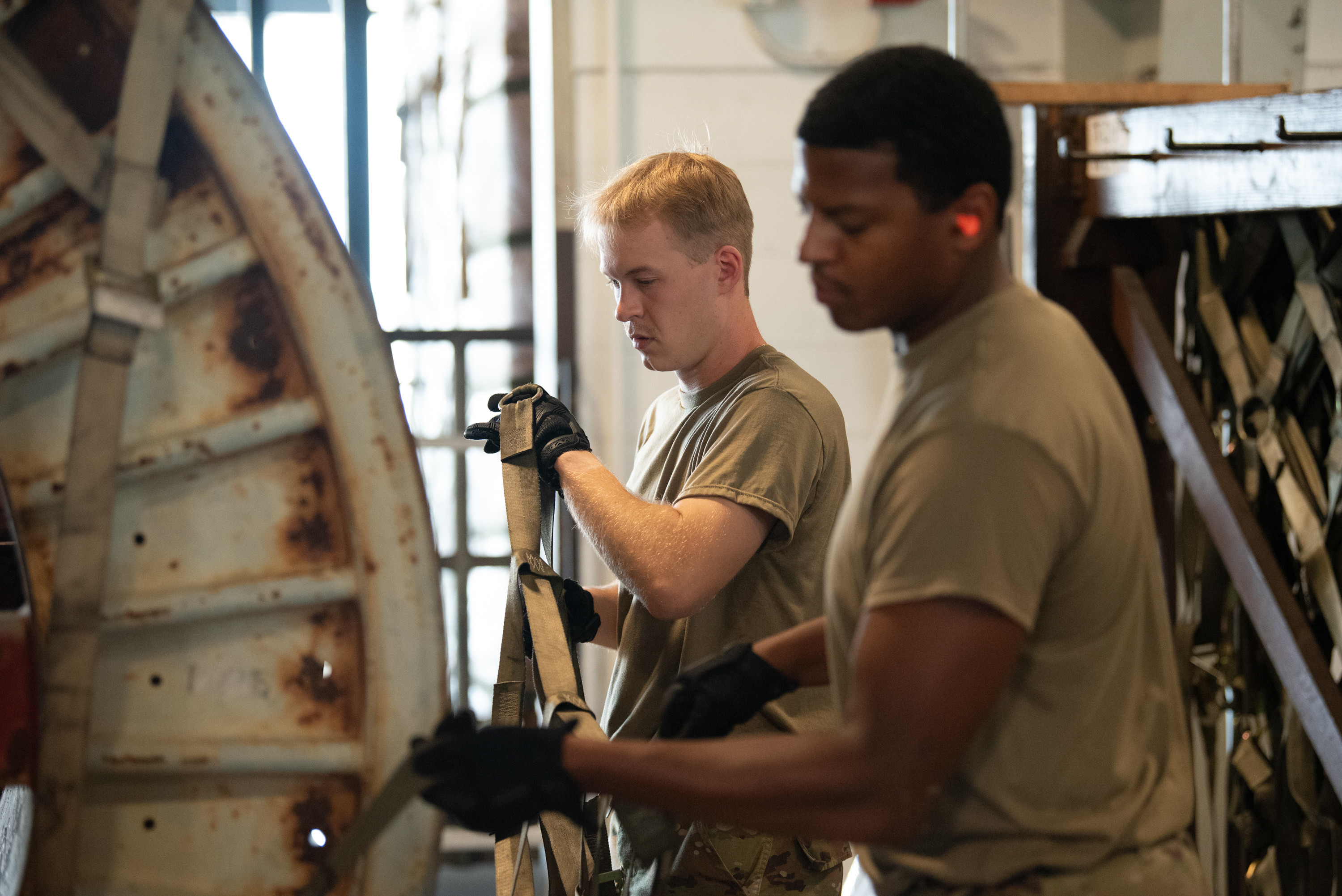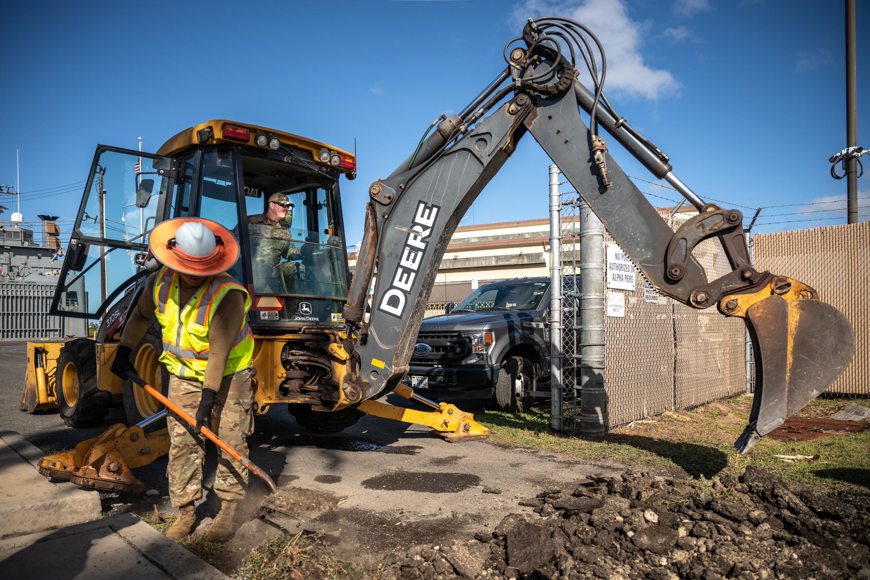 Tech. Sgt. Patrick Lawrence, left, and Tech. Sgt. Jason Rutherford, right, both construction specialists from the Kentucky Air National Guard’s 123rd Civil Engineer Squadron, work with their active-duty counterparts from the 647th Civil Engineer Squadron to replace asphalt pavement at Joint Base Pearl Harbor-Hickam, Hawaii, on July 29, 2025. The Kentucky troops are among more than 70 personnel from the Louisville-based 123rd Airlift Wing to conduct annual training here over 14 days, sharpening skills that enhance their global employment as Multi-Capable Airmen. (U.S. Air National Guard photo by Dale Greer)